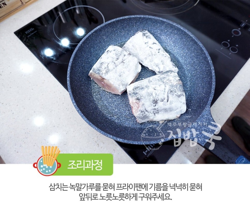 5. 삼치는 녹말가루를 묻혀 프라이팬에 기름을 넉넉히 묻혀 앞뒤로 노릇노릇하게 구워주세요.