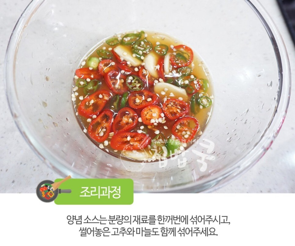 4. 양념소스는 분량의 재료를 한꺼번에 섞어주시고, 썰어놓은 고추와 마늘도 함께 섞어주세요.