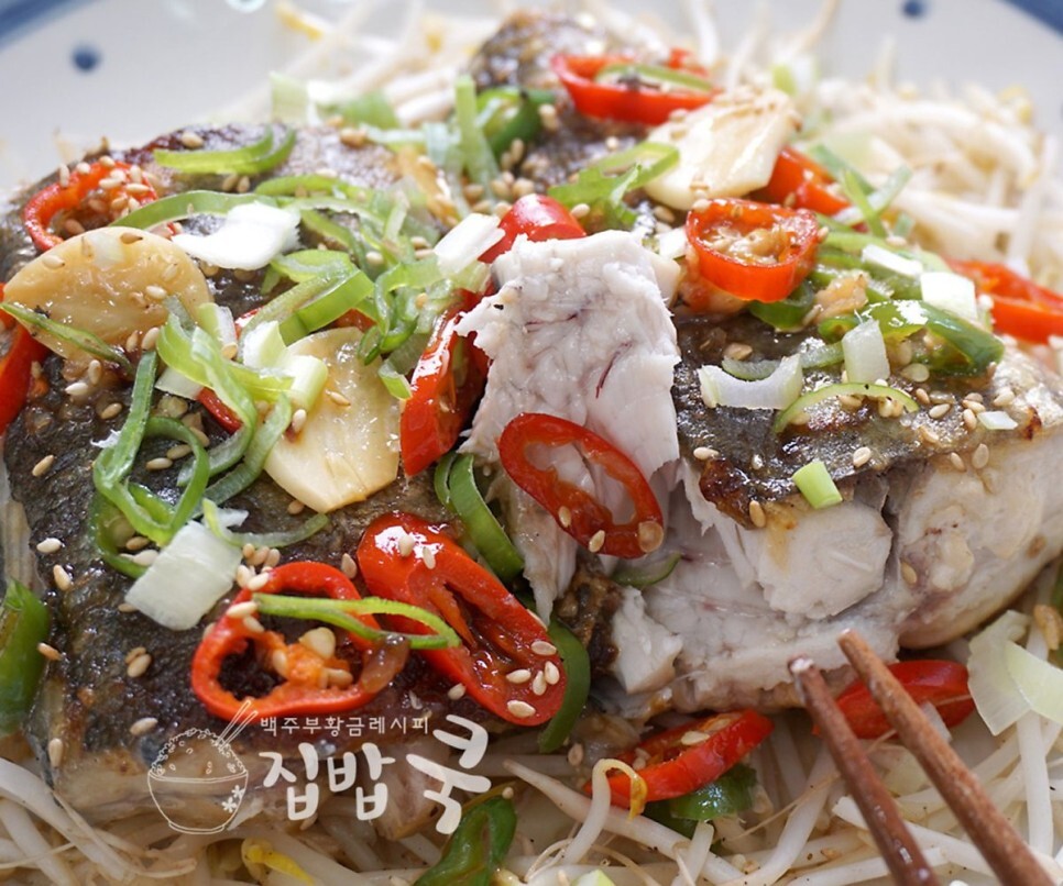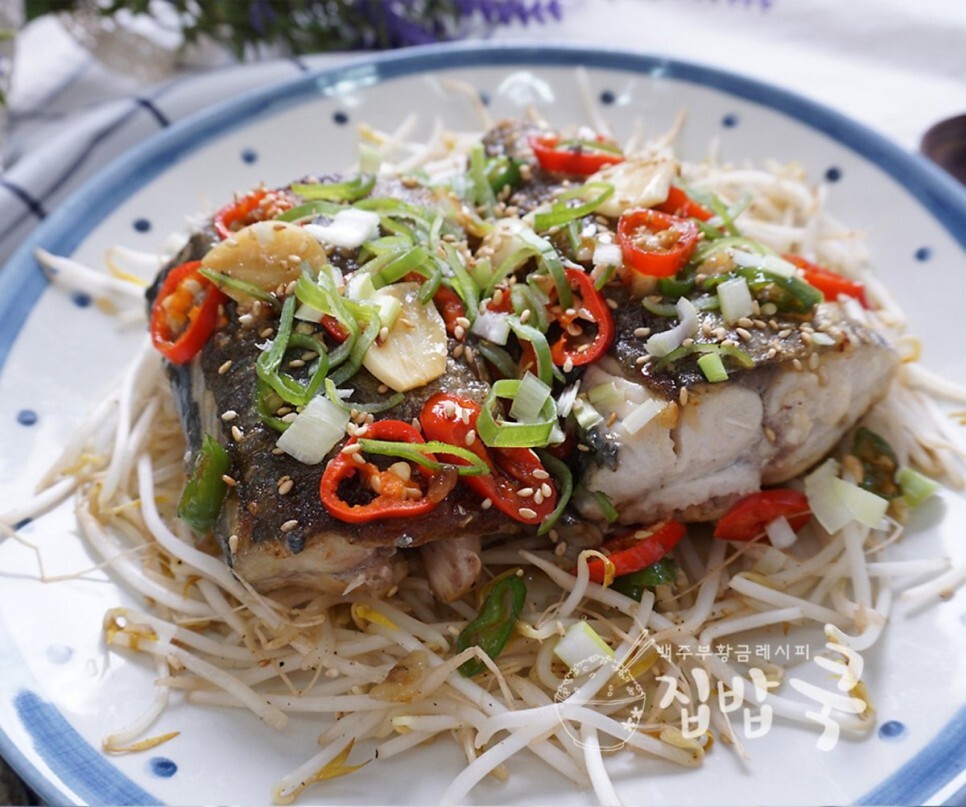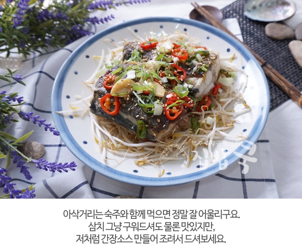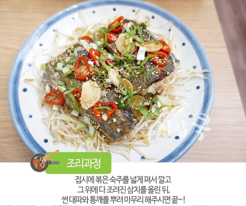 7. 접시에 볶은 숙주를 펴서 깔고 그 위에 다 조려진 삼치를 올린 뒤, 썬 대파와 통깨를 뿌려주면 끝~!
