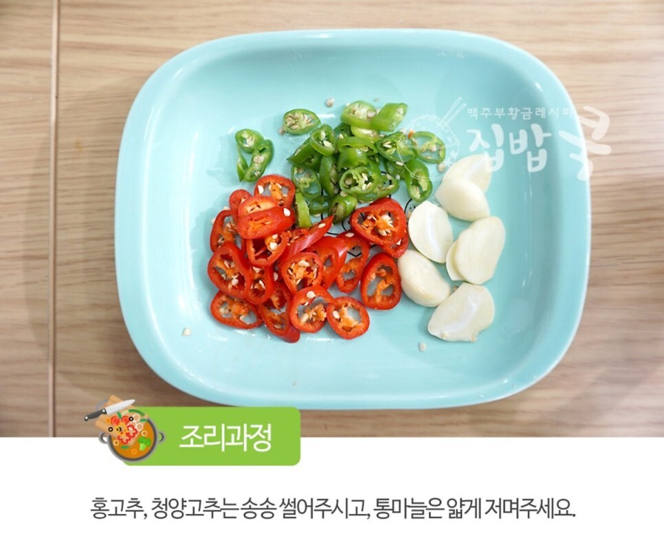 3. 홍고추, 청양고추는 송송 썰어주시고, 통마늘은 얇게 썰어주세요.