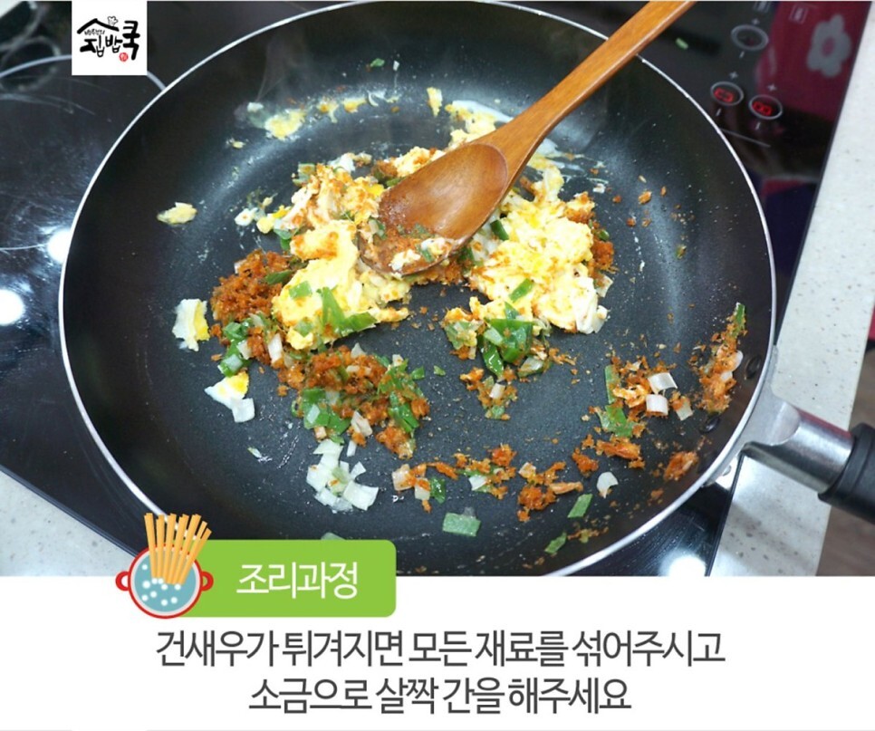 4. 계란이 익기 시작하면 파기름 위로 건새우가루를 넣고 계란과 섞지 마시고 파 기름에 건새우 가루를 튀겨주세요. (핵심 포인트입니다!! 별 5개 중요 땡땡)