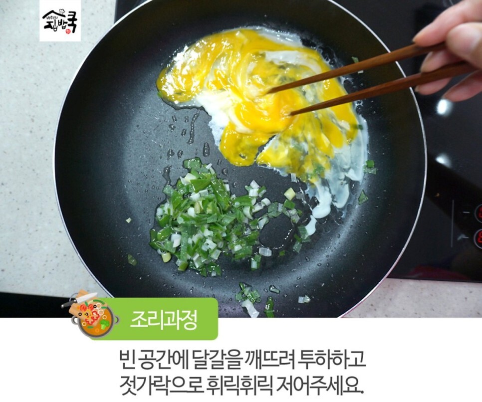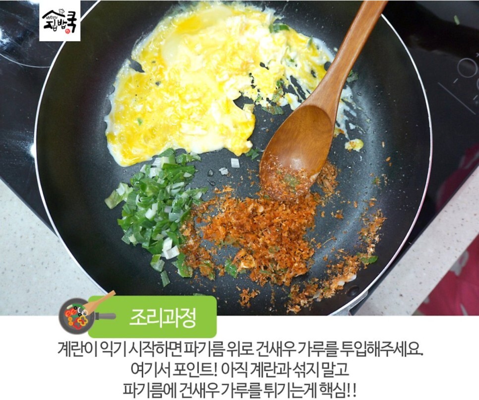 4. 계란이 익기 시작하면 파기름 위로 건새우가루를 넣고 계란과 섞지 마시고 파 기름에 건새우 가루를 튀겨주세요. (핵심 포인트입니다!! 별 5개 중요 땡땡)