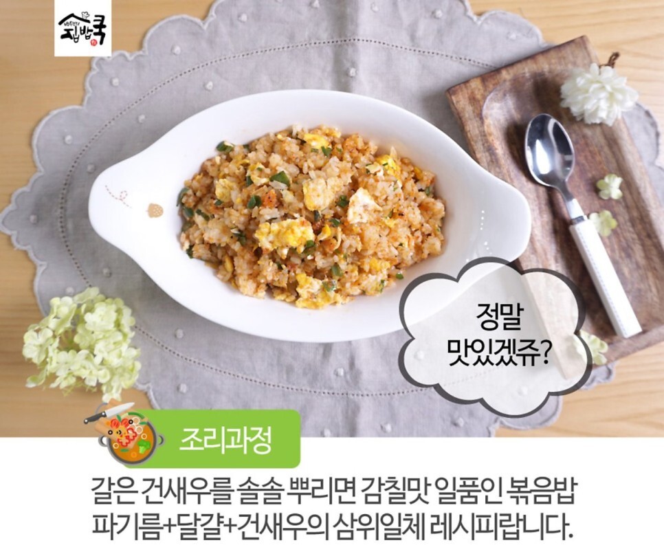 국가기밀급의 맛! 건새우 볶음밥 오늘은 새우볶음밥이에요~ 오래된 건새우를 갈아서 별 재료 없어 휘리릭~볶아서 볶음밥 했더니 감칠맛이 일품이에요! 쉽고 간단하니깐 반찬 하기 싫은 날 한번 도전해보세요~!