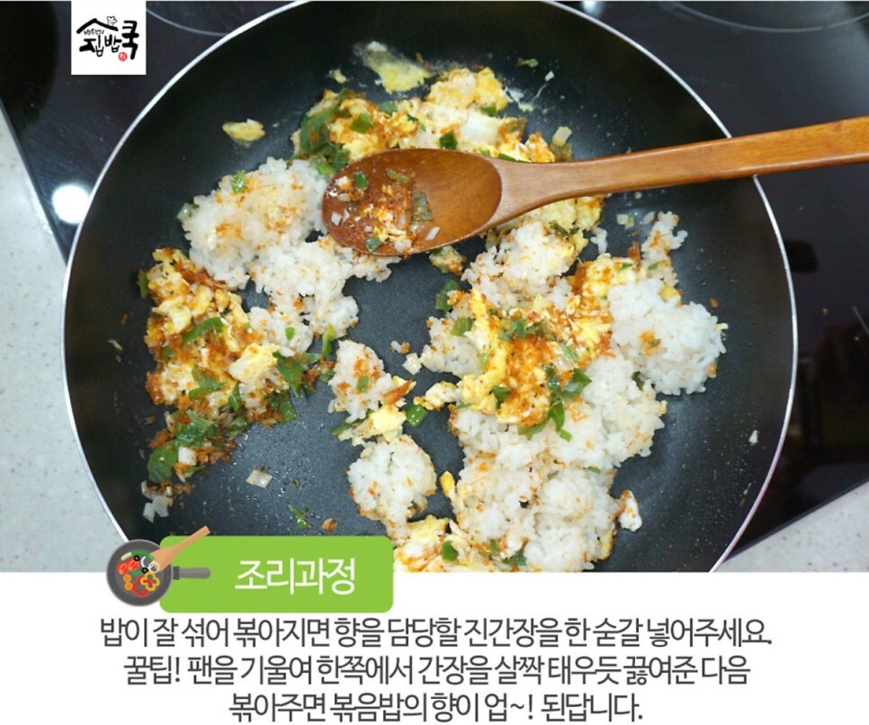 7. 밥이 잘 볶아지면 향을 담당할 진간장을 한 숟갈 넣어주시는데 여기서 꿀팁!! 팬 한쪽을 기울여 한쪽 빈 공간에서 간장을 살짝 태우듯 끓여준 다음 볶아주면 볶음밥의 향이 업그레이드 된답니다.