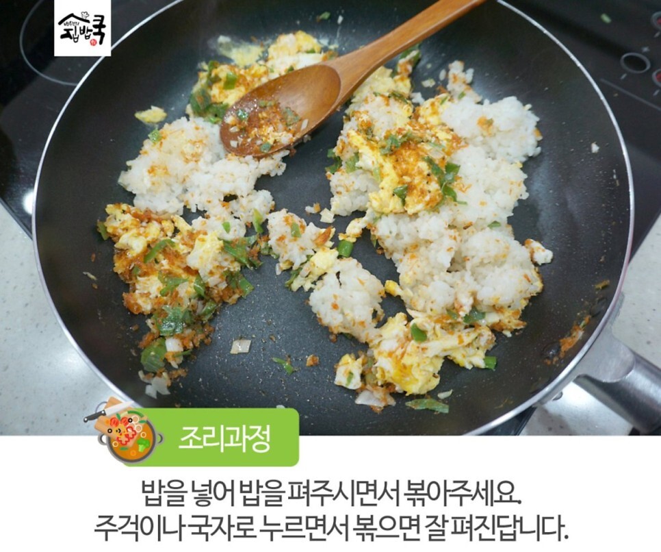 6. 밥을 넣고 밥을 펴주시면서 골고루 볶아주세요. (주걱이나 국자로 누르면서 볶으면 잘 펴진답니다.)