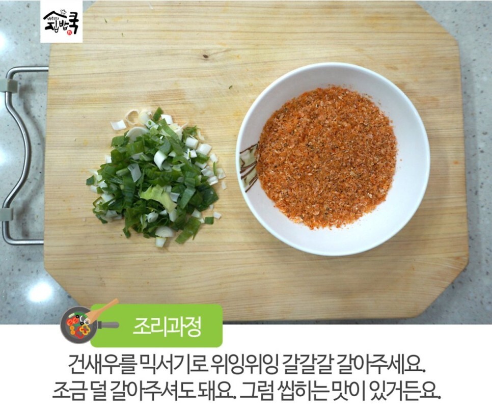 1. 건새우를 믹서기로 갈아주세요. 취향에 따라 곱게 갈아서 쓰셔도 되고요. 씹는 식감을 위해서는 조금 덜 갈아주셔도 돼요.