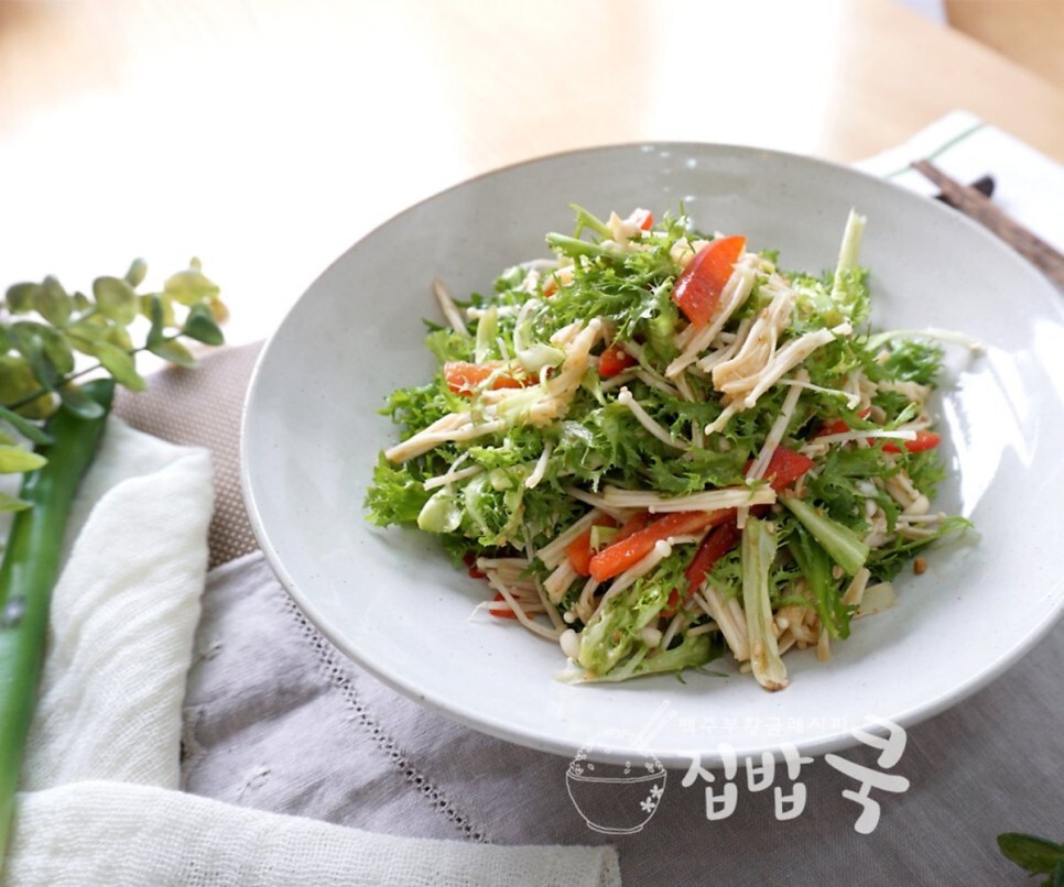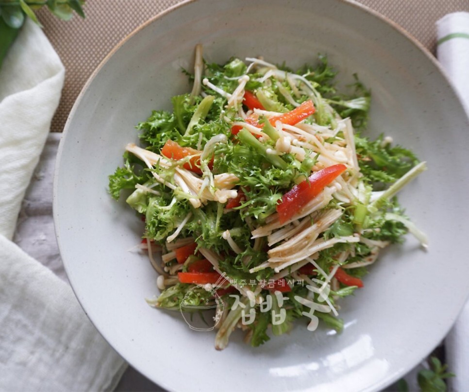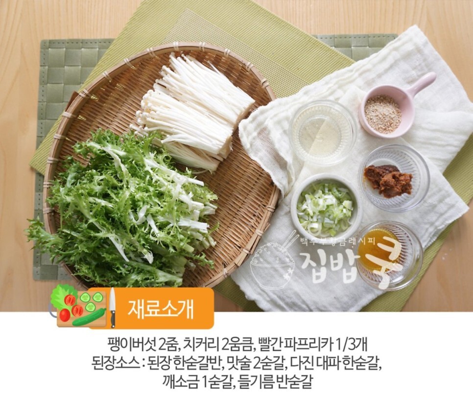 팽이버섯과 치커리를 생으로 무친 건강한 요리~ 저는 오늘 된장소스로 만들어봤어요. 마트에서 흔히 볼 수 있는 저렴한 팽이버섯은 우리가 식이 섬유 덩어리라고 알고 있는 양배추보다 식이 섬유가 2배로 많다고 해요.