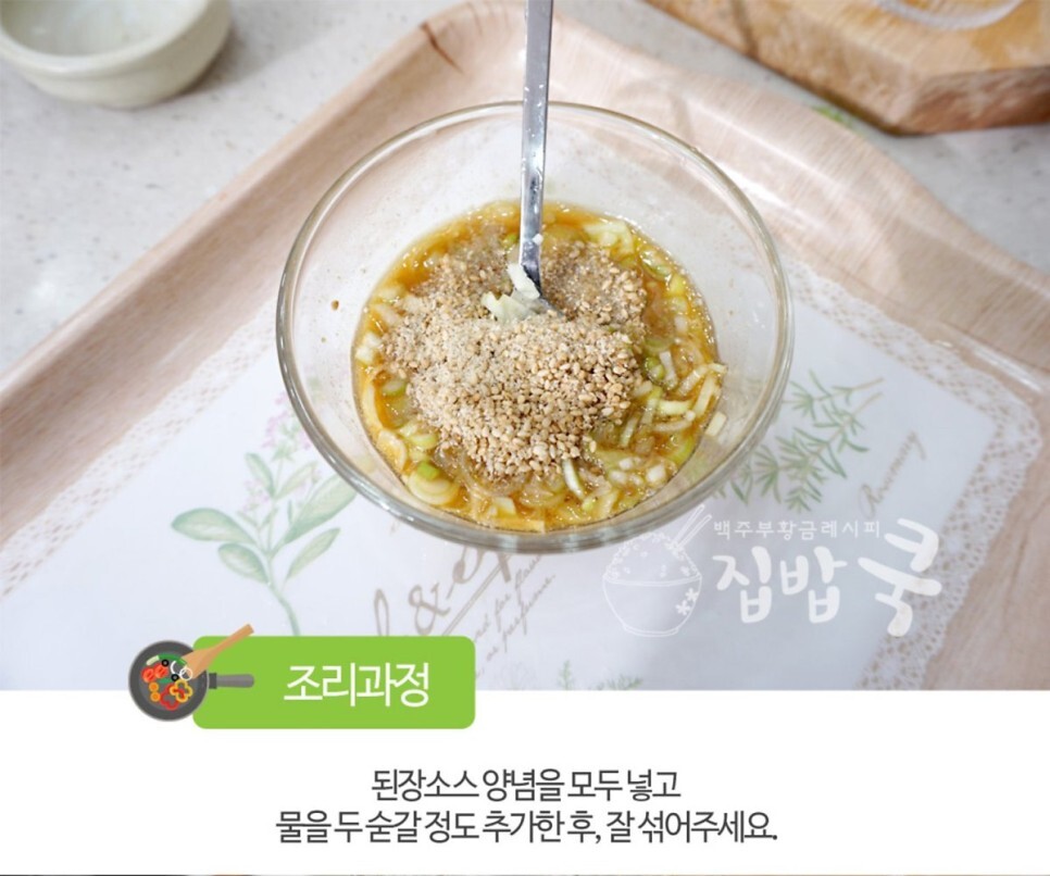 4. 된장소스 양념을 (된장 한 숟갈반, 맛술 2 숟갈, 다진 대파 한 숟갈, 깨소금 1 숟갈, 들기름 반 숟갈) 모두 넣고 물을 두 숟갈 정도 추가한 후, 잘 섞어주세요.