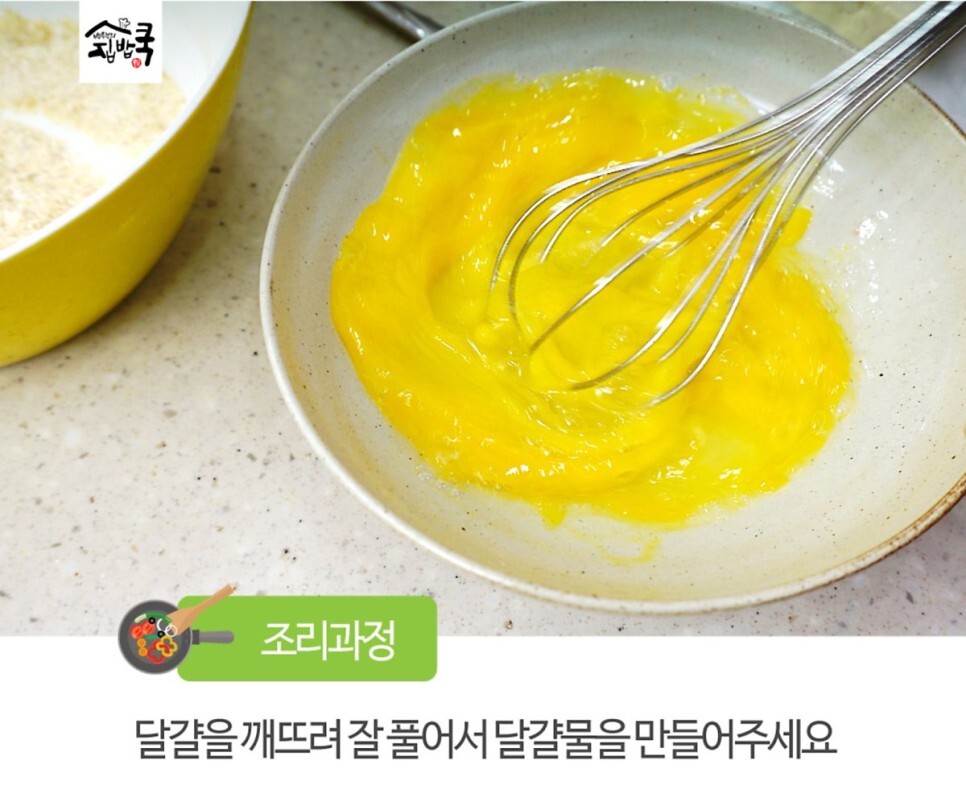 5. 이번에 달걀에 퐁당~노란 달걀물로 겉옷을 입혀주세요.