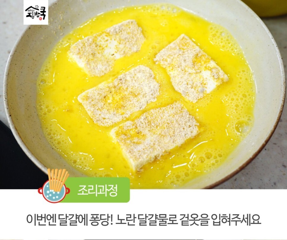 5. 이번에 달걀에 퐁당~노란 달걀물로 겉옷을 입혀주세요.
