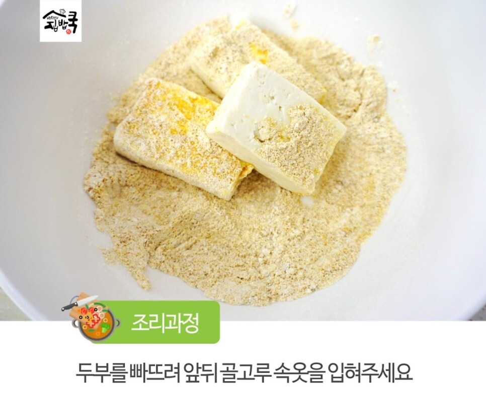 3. 밀가루와 카레가루 섞은 그릇에 두부를 빠뜨려 앞뒤 골고루 속옷을 입혀주세요.