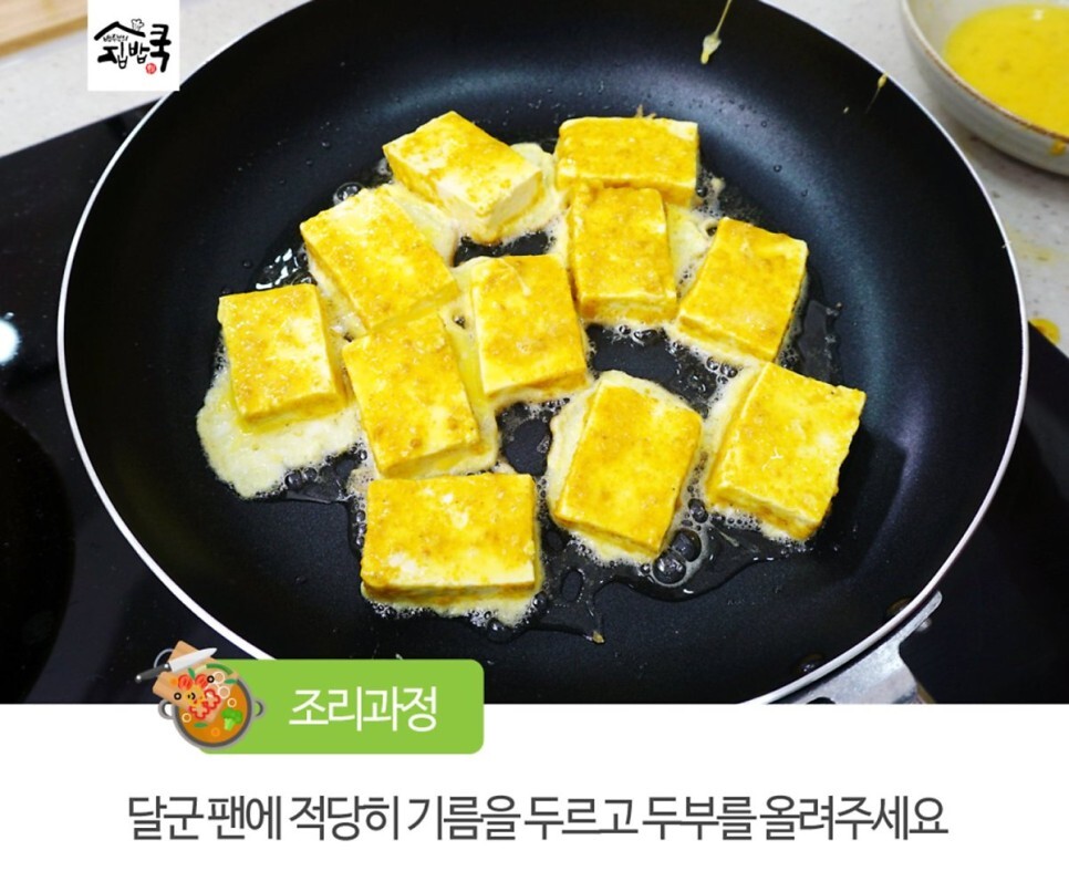6. 달군 팬에 적당히 기름을 두르고 두부를 올려주세요.