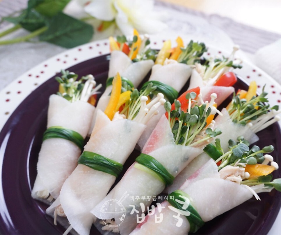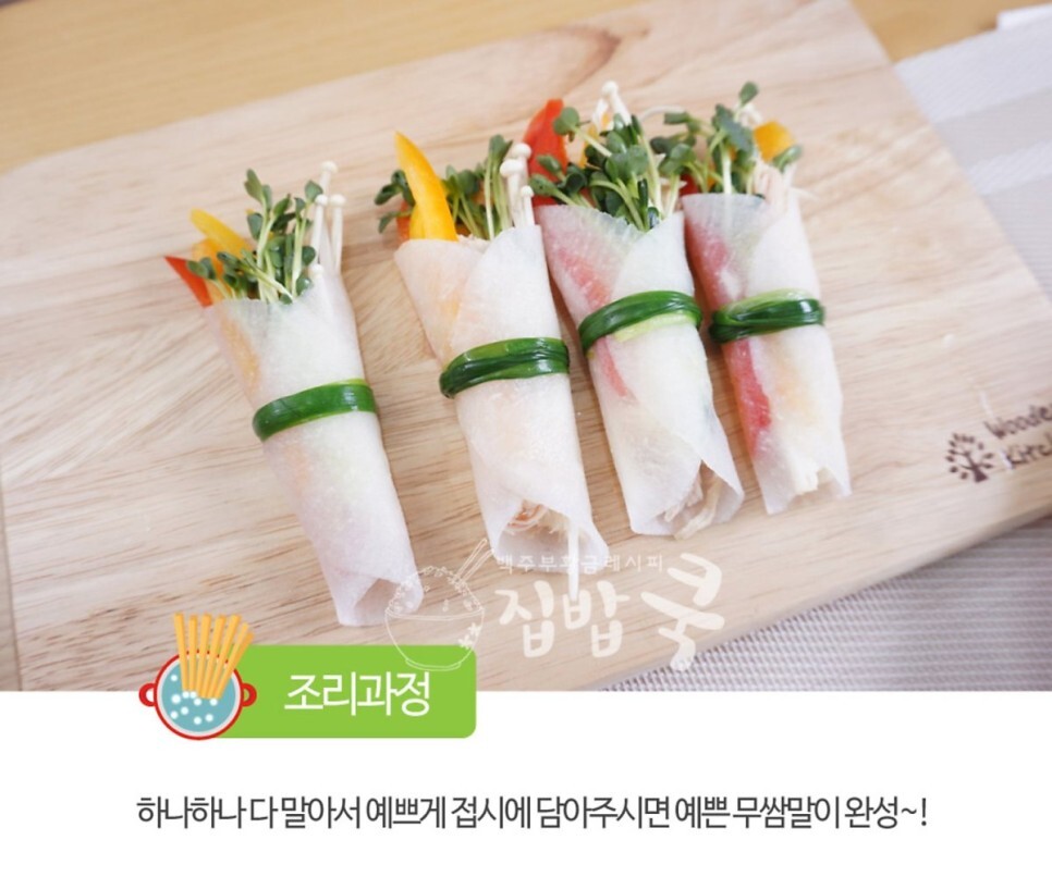 집들이 음식 메뉴로 많이 추천되고 있는 요리 중 보기도 예쁘고 맛도 예쁜 무 쌈 말이! 돌돌 말아~ 돌돌~하나하나 꼭꼭 싸주고 벨트까지 둘러줘야 해서 좀 귀찮을 순 있지만 귀찮은 건 잠시...