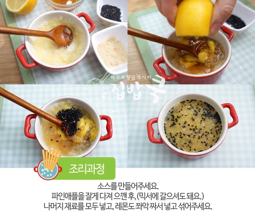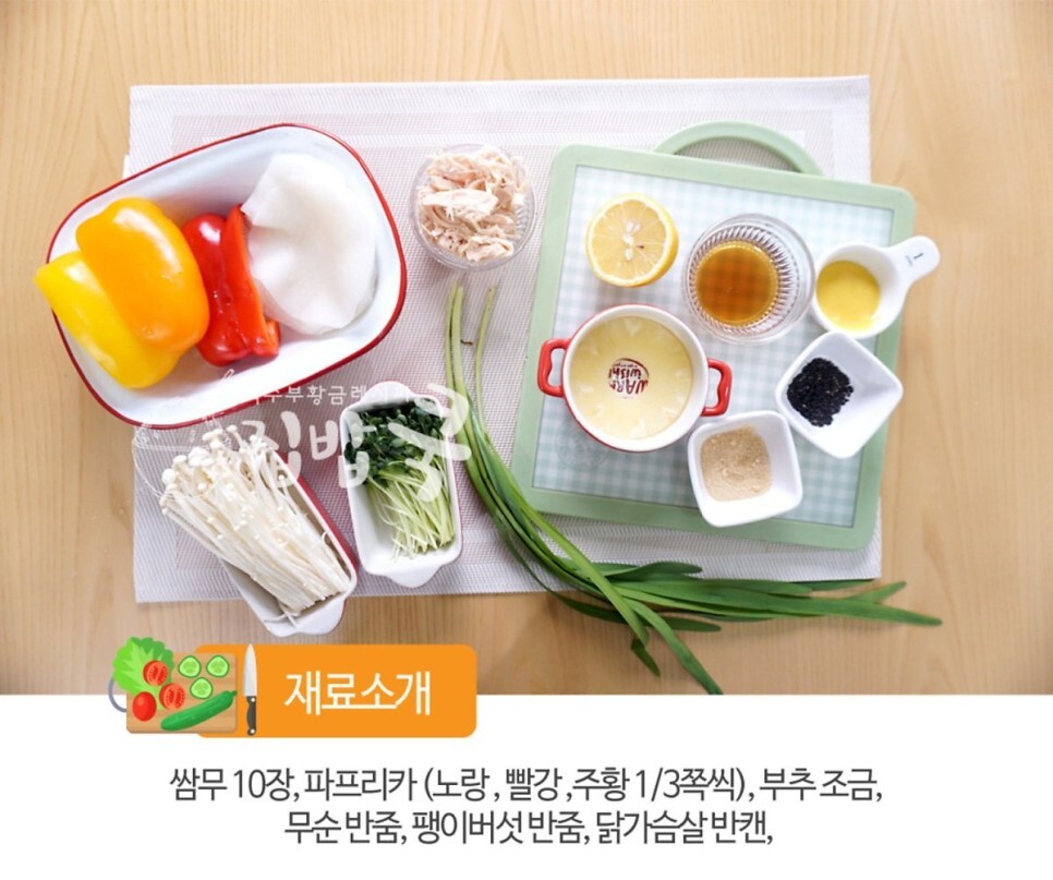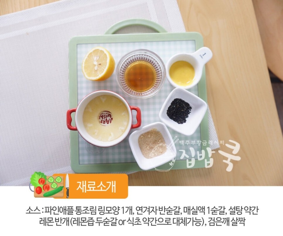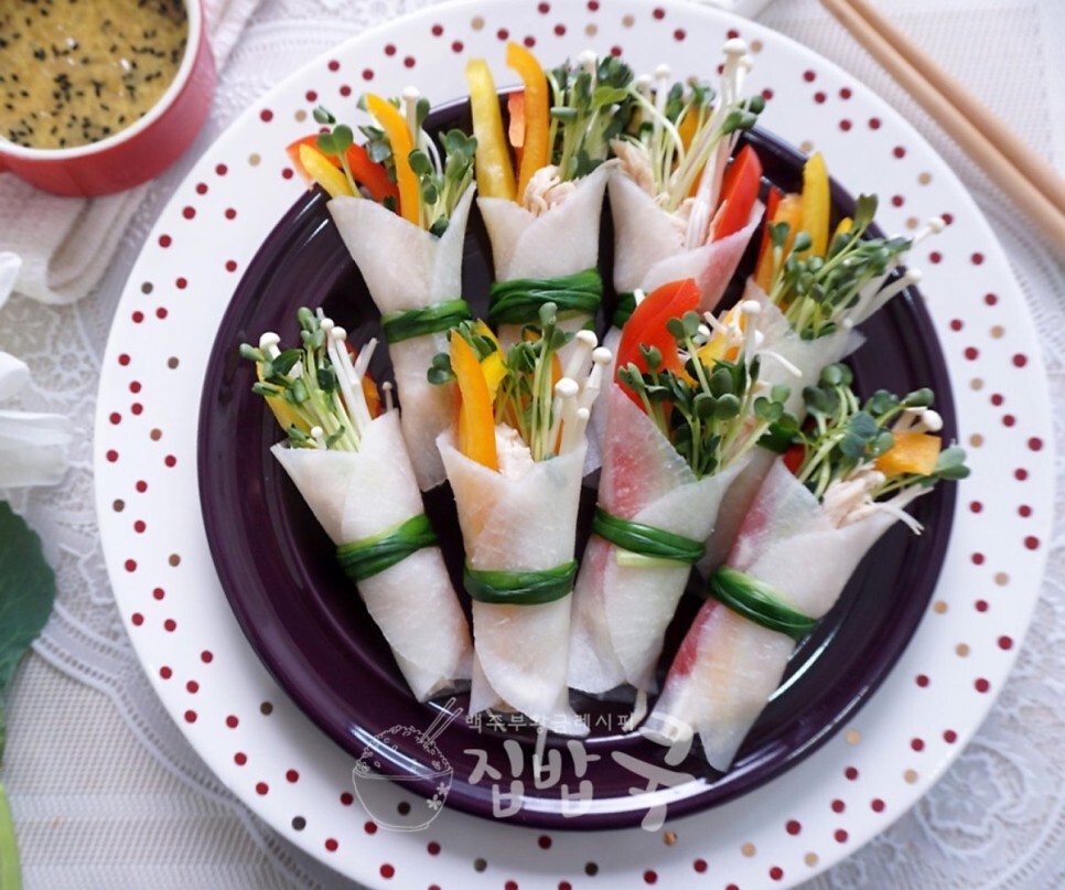 무 쌈 말이는 가열을 하지 않는 요리라 재료 그대로의 프레시한 맛을 만끽하실 수 있어요 새콤달콤한 파인애플 겨자소스에 퐁~당 빠뜨려 드시면 훨씬 맛있답니다~ 무 쌈 말이로 특별한 날 음식 솜씨 자랑해보세요~