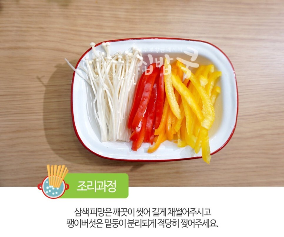 1. 삼색 피망은 깨끗이 씻어 길게 채 썰어 주시고 팽이버섯은 밑동이 분리되게 적당히 찢어주세요