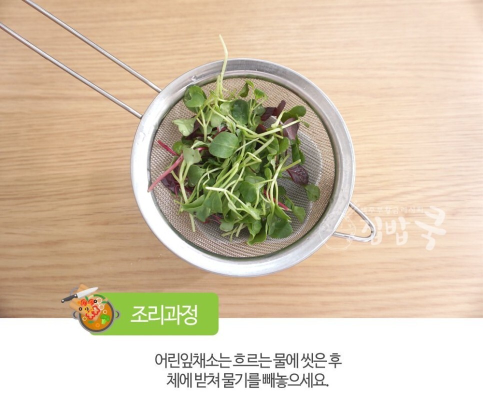 3. 여린 잎채소는 흐르는 물에 씻은 후 체에 밭쳐 물기를 빼놓으세요. (조리시간을 줄이기 위해 이때쯤 냄비 혹은 궁중팬에 기름을 올려놓고 기름 온도를 올려주세요.)