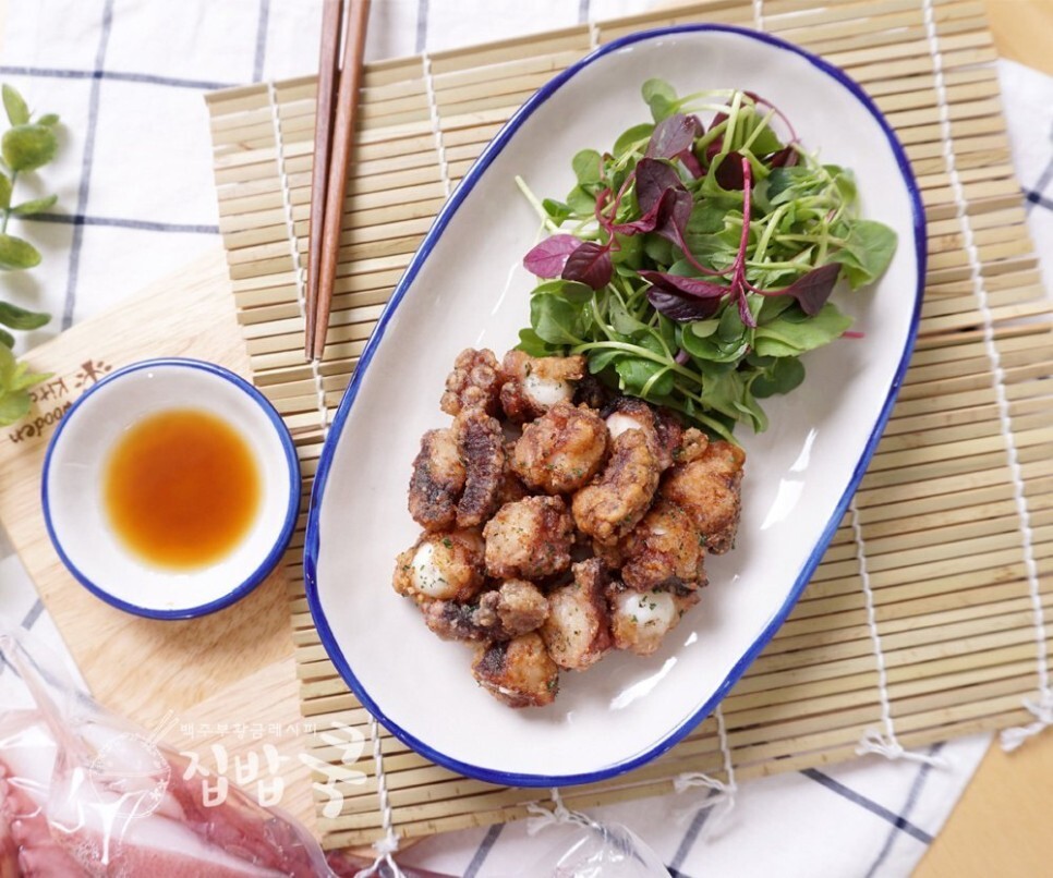 데쳐진 문어를 이용해서 하시면 살짝만 튀겨내도 돼서 훨씬 수월하게 문어 튀김을 만드실 수 있어요 밀가루나 달걀 등은 넣지 않고 밑간을 한 후, 오직 전분가루만으로 튀겨서 문어의 맛을 더욱 잘 느끼실 수 있습니다. 더불어 드실 때 바삭하고 쫄깃한 문어 튀김을 간장에 콕 찍어 드셔 보세요! 어른들에 맥주 안주로 혹은 아이들 간식으로도 좋으니깐 꼭 한번 드셔 보세요 강력 추천합니다!!