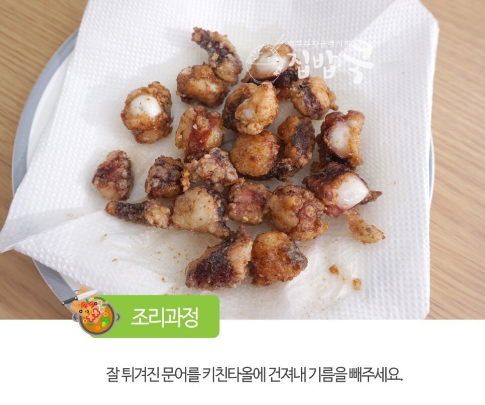 6. 잘 튀겨진 문어를 키친타월에 건져내 기름을 주세요.