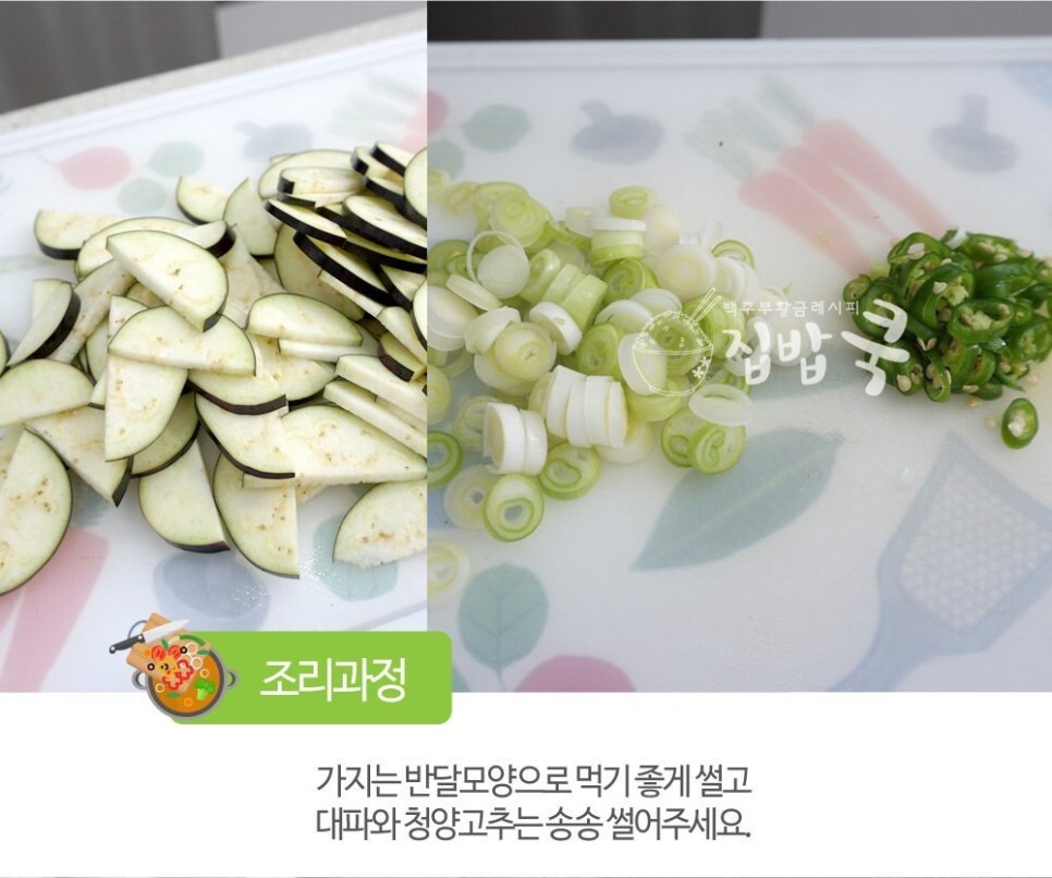 1. 가지는 반달 모양으로 썰어주시고 대파와 청양고추는 송송 썰어주세요.