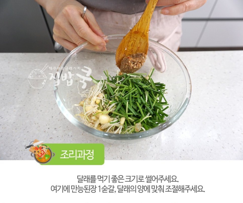 1. 달래를 먹기 좋은 크기로 썰고, 여기에 만능 된장 1 숟갈 넣어 주세요. (달래의 양에 따라 틀려요 양에 맞춰 조절하세요)