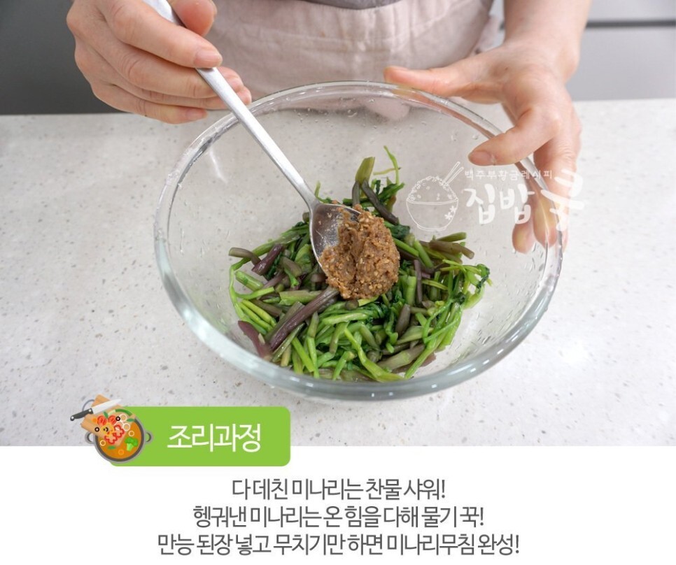 2. 잘 데친 미나리는 찬물로 한번 헹궈 주시고 물기를 꼭 짜주세요. 그다음 만능 된장을 반 스푼 넣고 무치기만 하면 미나리 무침도 완성!!!