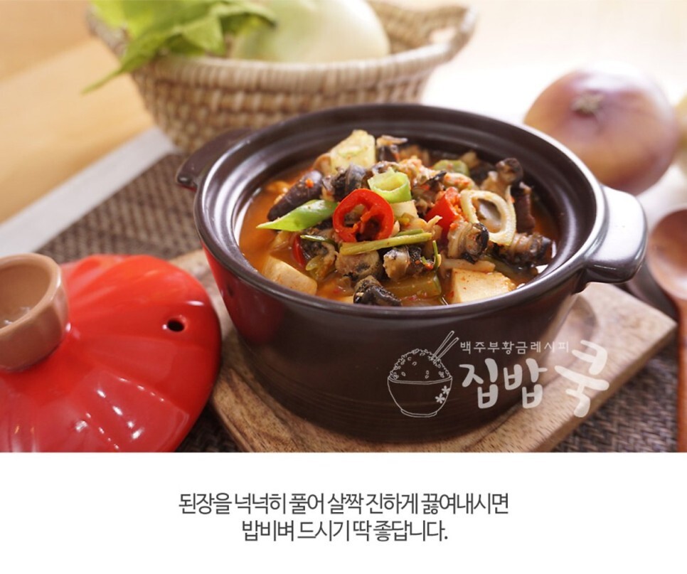 쫄깃쫄깃 씹히는 맛이 좋은 우렁이 넣고 구수한 된장찌개 끓여봤어요 메인 재료인 우렁이 살이 작다 보니 일반적으로 된장찌개에 넣을 때 써는 거보다 좀 작게 썰어 끓이시는 게 좋고요 된장을 넉넉히 풀어 살짝 진하게 끓여 내시면 밥 비벼 드시기 딱 좋답니다.