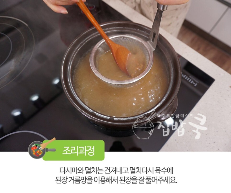 4. 다시마와 멸치는 건져내고 멸치 다시 육수에 된장 거름망을 이용해서 된장을 잘 풀어주세요.