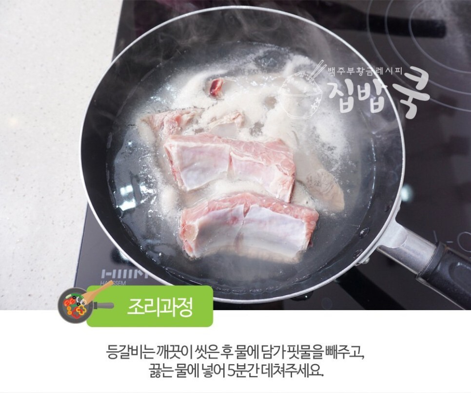 1. 등갈비는 흐르는 물에 한번 씻어서 혹시 남았을 뼛가루를 털고 등갈비가 물에 잠길 정도로 담가 30분 이상 등갈비 핏물을 빼주세요. 핏기가 어느 정도 많이 빠졌다면 끓는 물에 넣어 5분 이상 데쳐주세요.