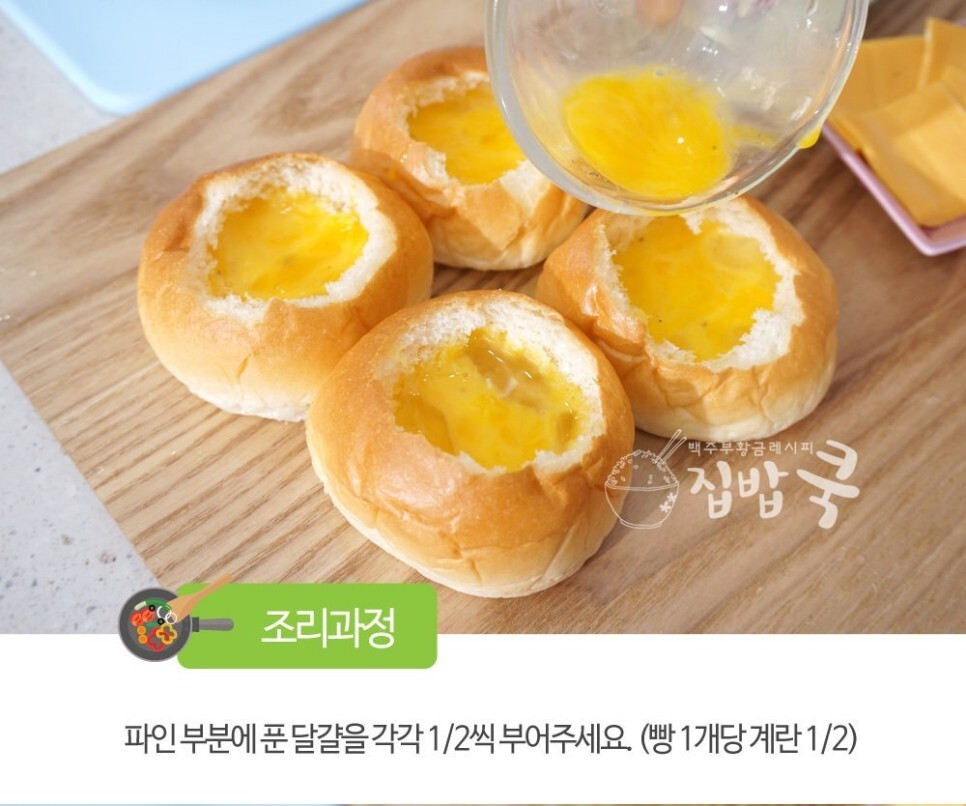 4. 파인 모닝빵에 푼 계란을 각각 1/2씩 부어주세요.