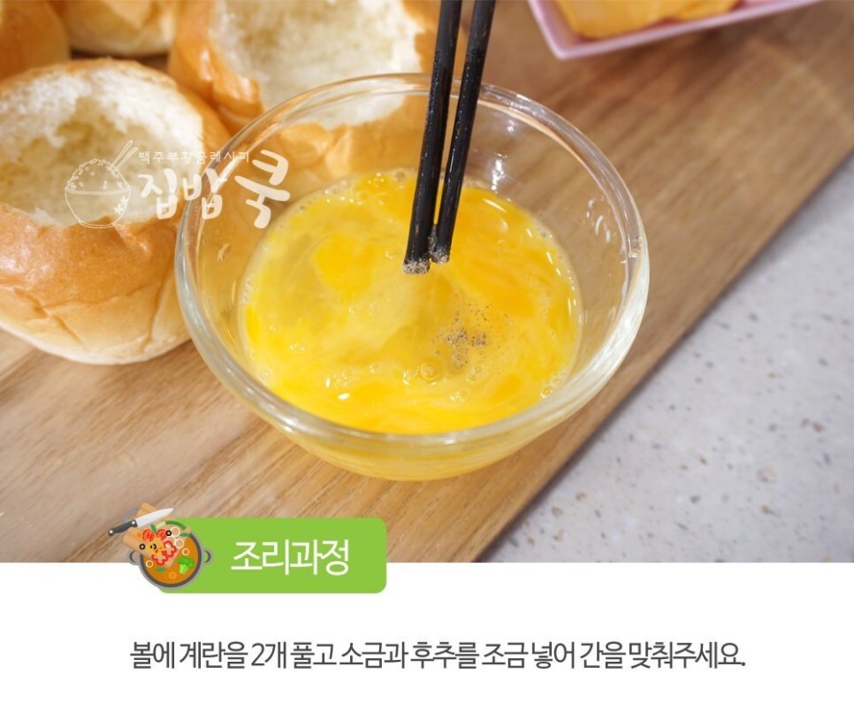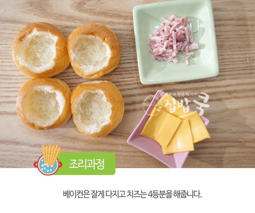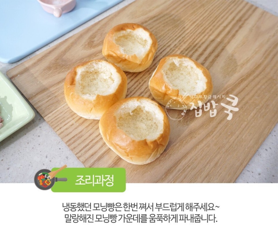 모닝빵 상태는 각 가정마다 상황이 다를 테니 모닝빵이 만약 말랑말랑한 상태면 바로 가운데를 움푹하게 파주셔도 됩니다.