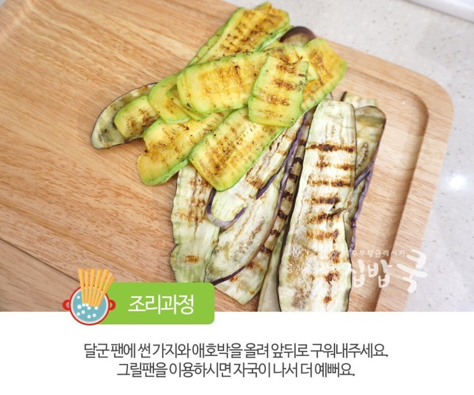 2. 달군 팬에 가지와 호박을 올려 앞뒤로 구워내 주세요..