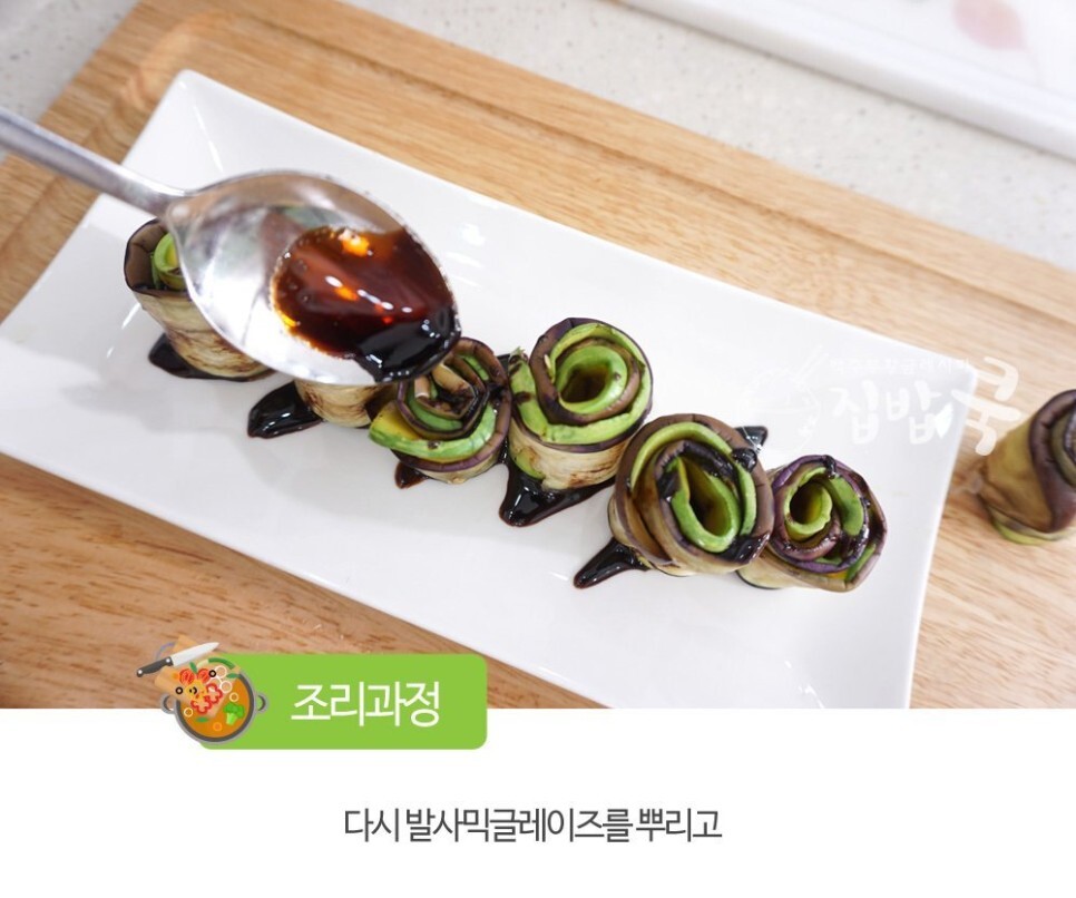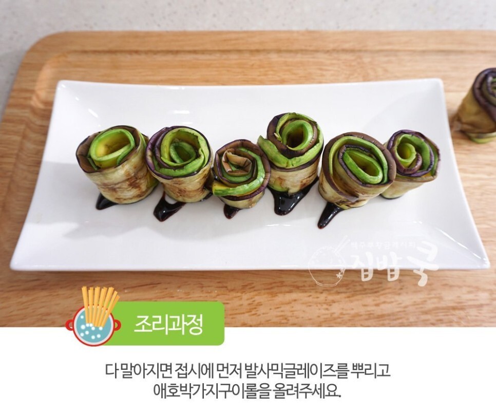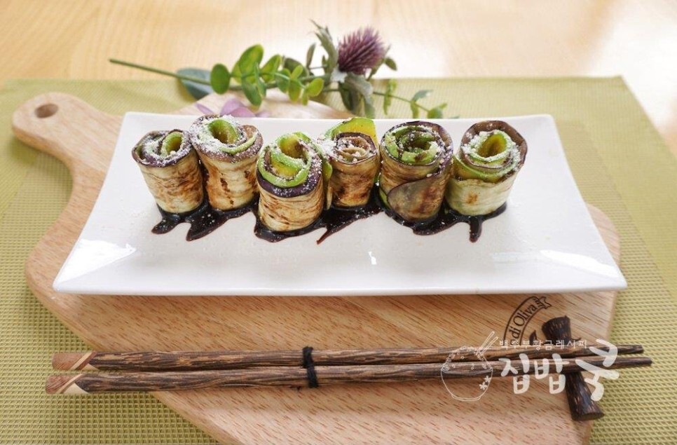 애호박 가지 롤은 조리법이 굉장히 간단하고 간단한 거에 비해 퀄리티는 굿입니다~!! 그리고 저기서 변형 레시피 한 가지!!! 애호박과 가지를 겹치고 말아 주기 전에 초밥 사이즈로 밥을 올려주고 말아 주시면 한 끼 식사로 훌륭한 레시피가 완성돼요~! 단!! 밥을 사용하실 때 발사믹은 필요 없고요 쌈장 및 된장을 이용해 주세요.