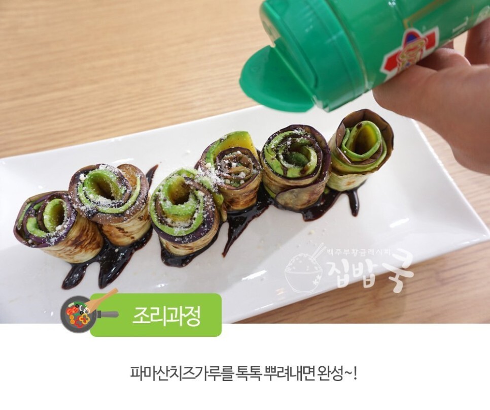 6. 다시 발사믹 글레이즈를 뿌리고, 그 위에 파마산 치즈가루를 톡톡 뿌려내면 애호박 가지 롤 완성~!!