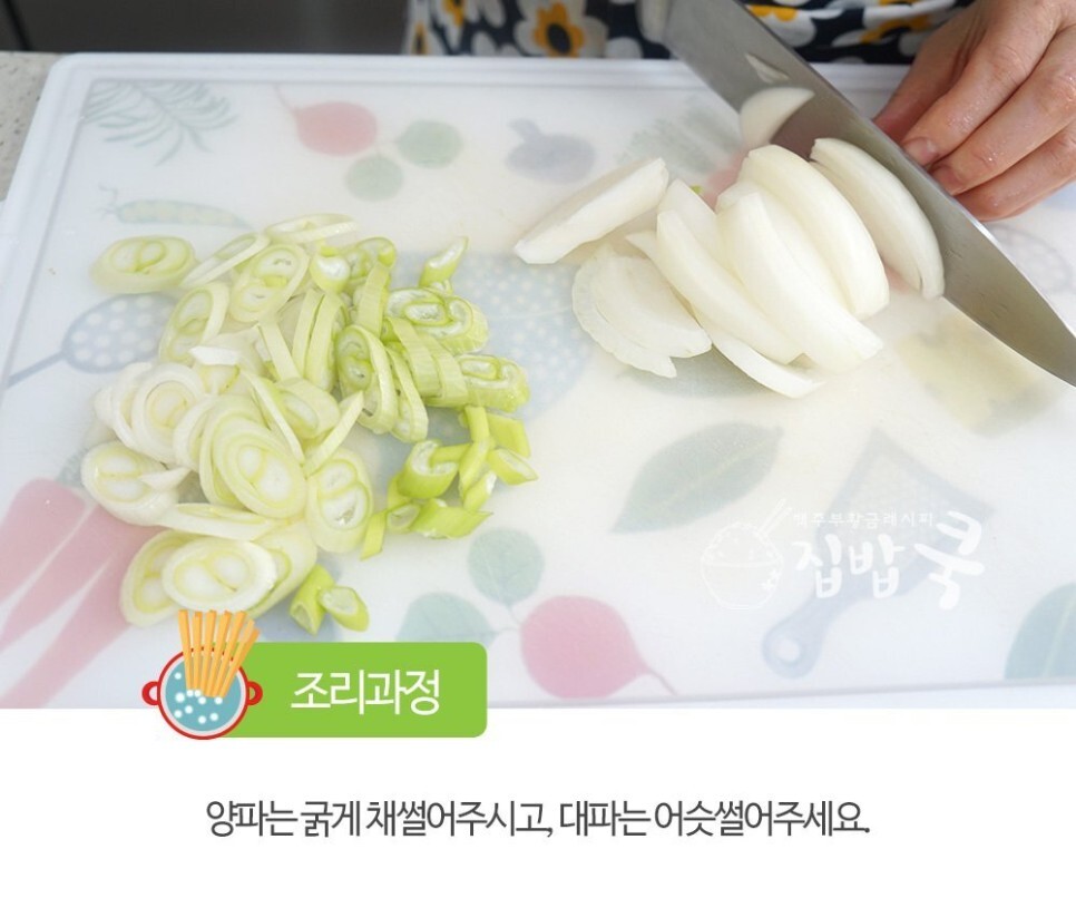 2. 이 친구들 빠지면 섭섭하죠~ 양파는 굵게 채 썰어주시고, 대파는 어슷 썰어주세요.