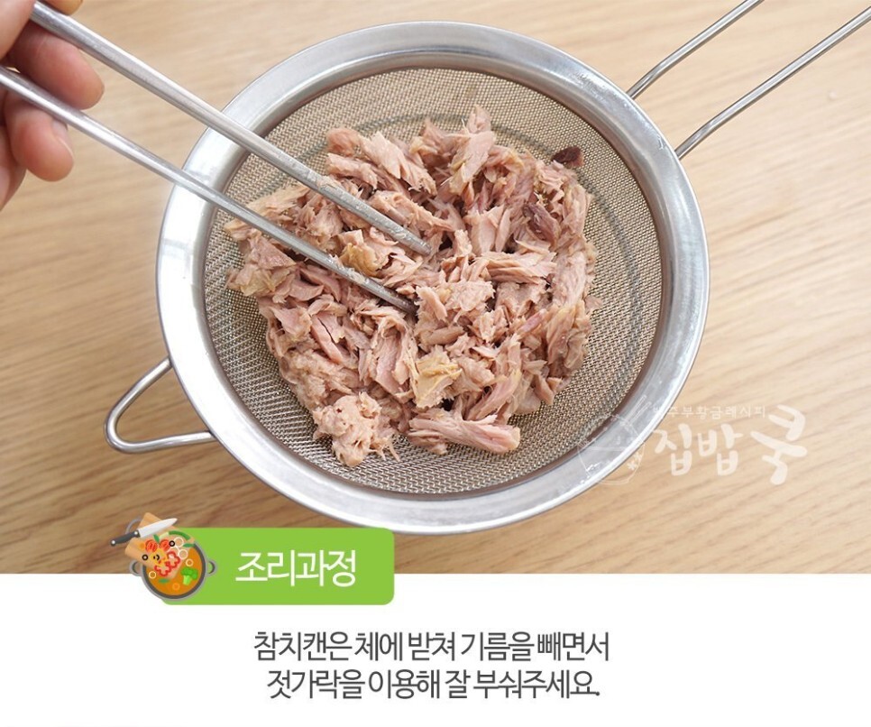 3. 참치를 체에 밭쳐 기름을 빼면서 젓가락을 이용해 잘 부숴주세요.