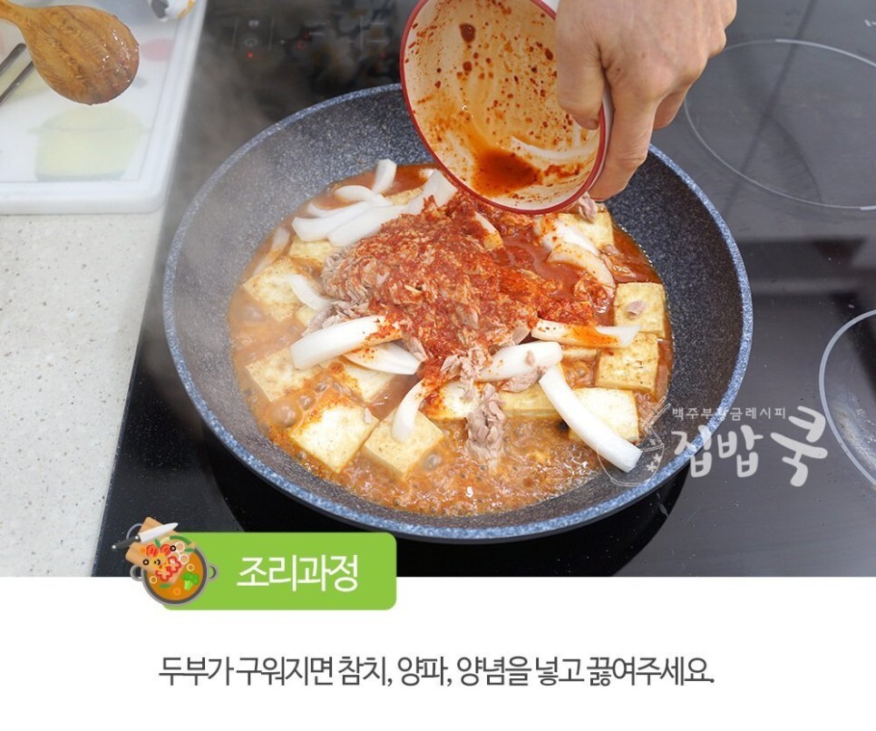 6. 두부가 구워지면 그 위에 참치, 양파, 양념을 넣고 끓여주세요.
