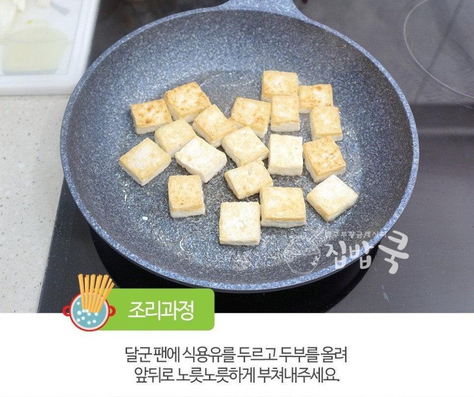 5. 달군 팬에 식용유를 두르고 두부를 올려 앞뒤로 노릇노릇하게 부쳐내 주세요.