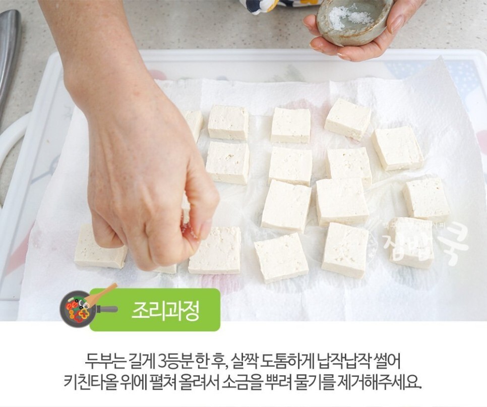 1. 두부는 길게 3등분 한 후, 살짝 도톰하게 납작납작 썰어 키친타월 위에 펼쳐 올려서 소금을 뿌려 물기를 제거해 주세요.