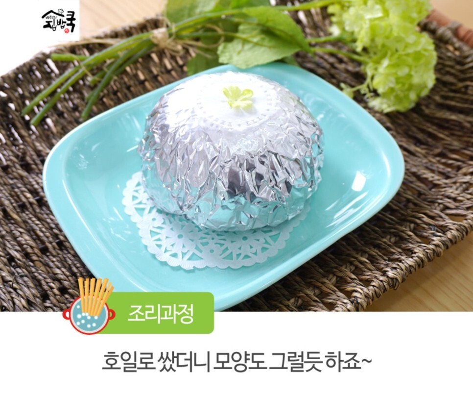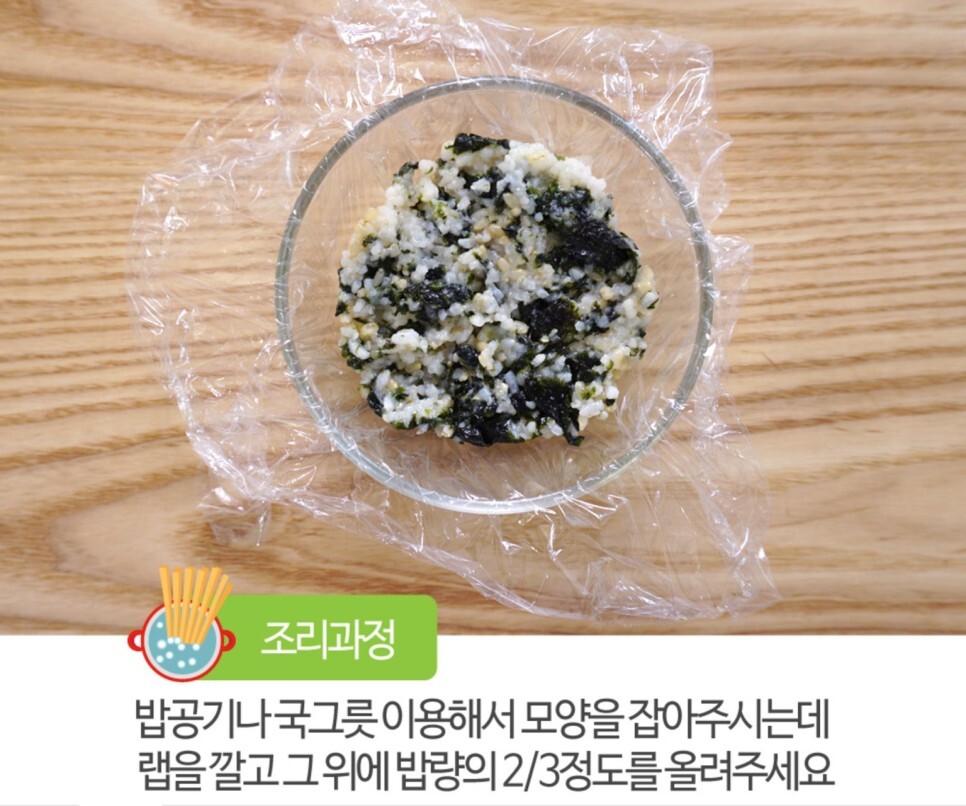 5. 밥공기나 국그릇 이용해서 모양을 잡아주시는데 랩을 깔고 그 위에 밥양의 2/3 정도를 올려주세요