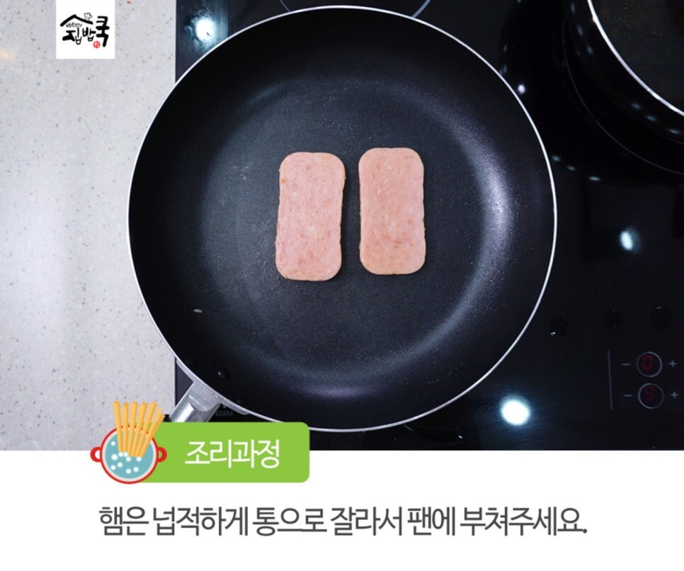 2. 스팸은 넓적하게 통으로 잘라서 프라이팬에 노릇노릇하게 구워주세요.