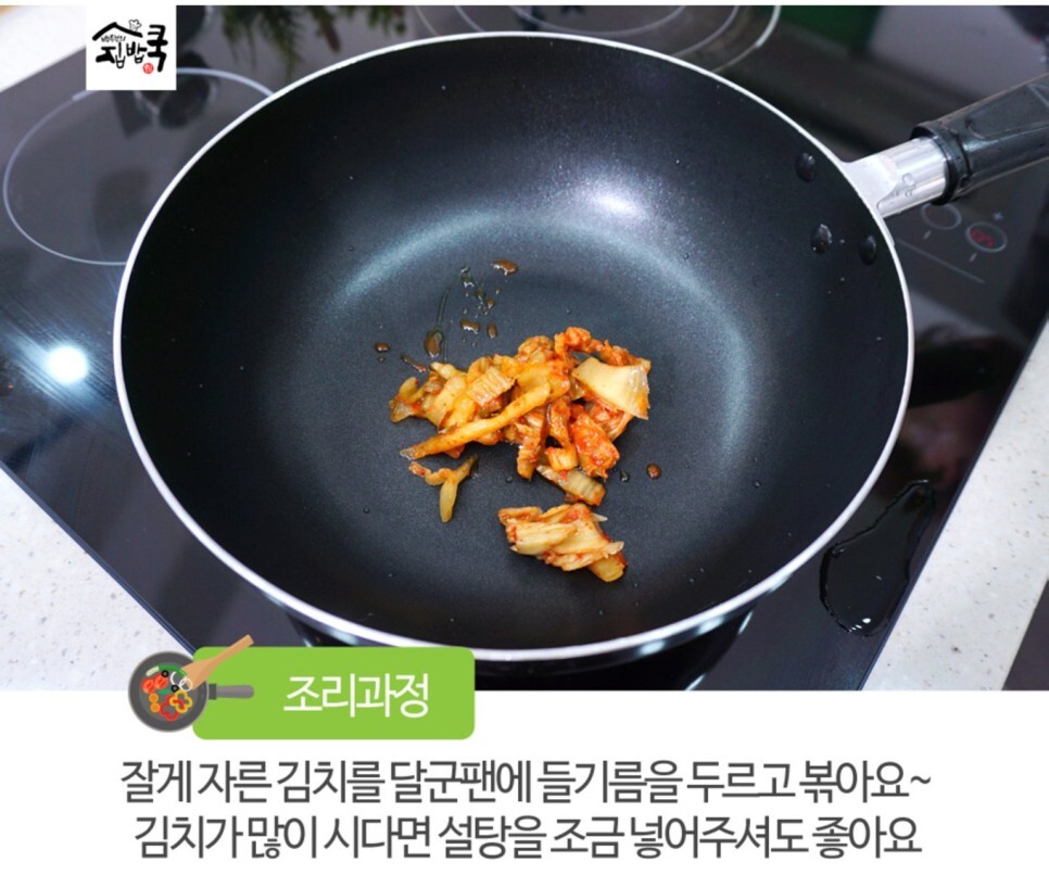 1. 먼저 김치를 잘게 자른 다음 프라이팬에 들기름을 두르고 볶아주세요 혹시 김치가 많이 시다면 설탕을 조금 넣어주시면 신맛이 중화가 가능합니다.