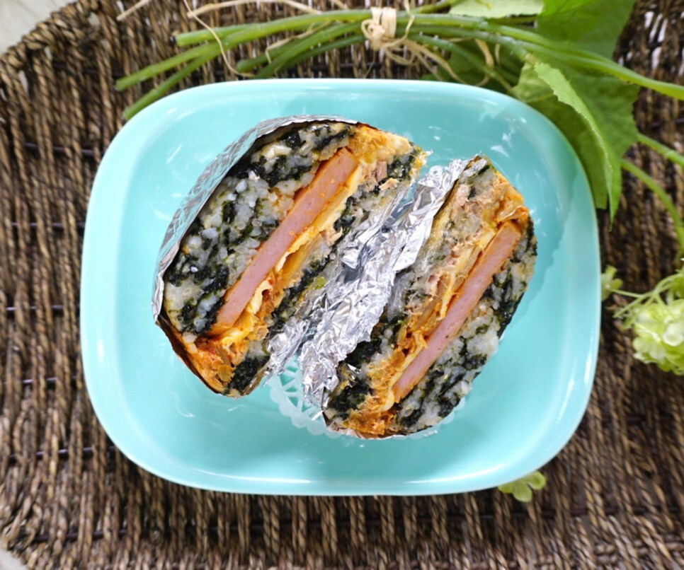 9. 치즈 - 다시 밥을 올려주신 다음에 랩을 모아서 싼 다음에 엎어서 빼주시면 밥버거 완성~!