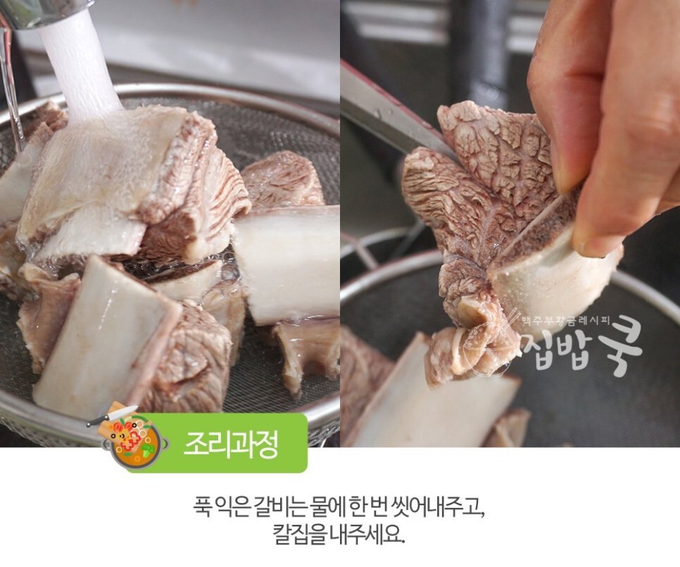 5. 푹 익힌 갈비는 물에 한 번 씻어내주고 칼집을 내주세요.