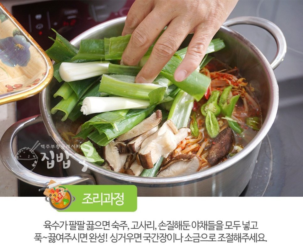 9. 육수가 끓으면 숙주, 고사리, 손질과 양념해둔 재료들을 모두 넣고 마지막으로 끓여주시면 갈비 육개장 완성~!
