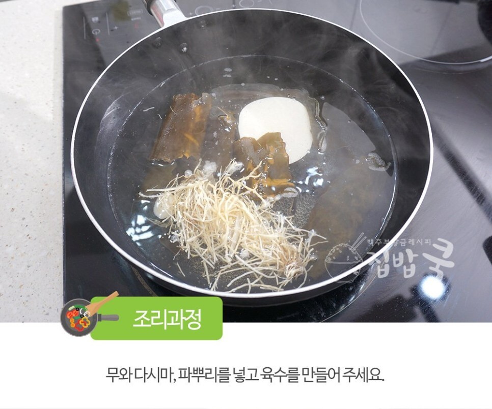 3. 무와 다시마, 파뿌리를 넣고 육수를 만들어 주세요. (집에 육수 다시가 있으시면 자유롭게 육수를 만들어주셔도 됩니다.)