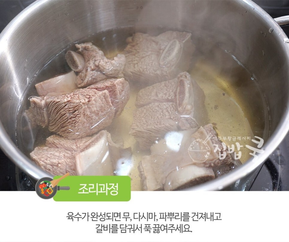 6. 육수가 완성되면 무, 다시마, 파뿌리를 건져내고 갈비를 육수 물에 담가서 푹 끓여주세요.
