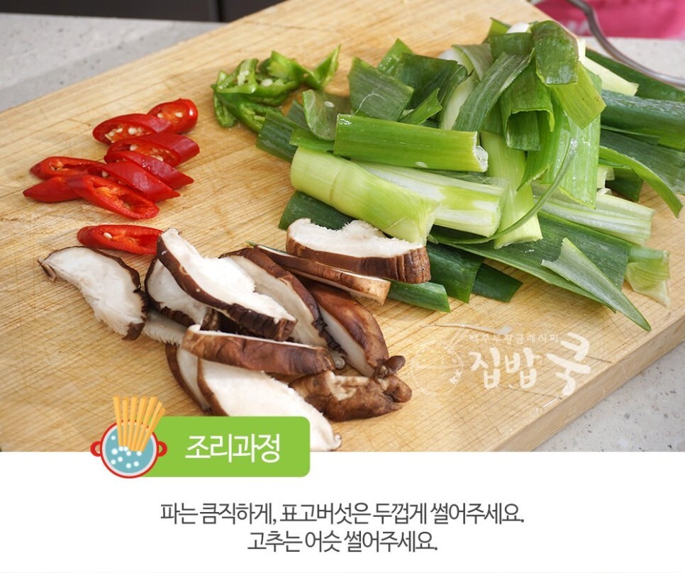 4. 파는 큼직하게, 버섯은 두껍게 썰어주시고 고추는 어슷 썰어주세요.