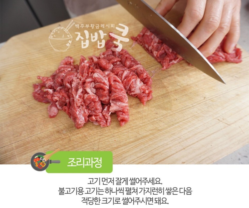 1. 고기를 먼저 잘게 썰어주세요 불고기용 고기는 하나씩 펼쳐 가지런히 쌓은 다음 적당한 크기로 잘게 썰어주시면 돼요.