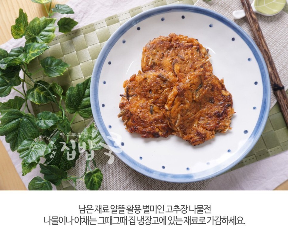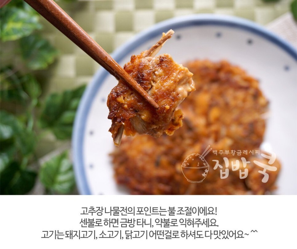 남아있는 나물과 식재료로 고추장 나물전을 해봤는데요 포인트는 반죽과 약불이 포인트! 꼭 기억해 주시고 간이 싱겁게 느껴지시면 양념간장에 콕 찍어 드셔도 좋습니다. 그리고 돼지고기나 닭고기를 이용해서 하실 경우는 꼭! 속에 있는 고기까지 잘 익어주세요 다음에도 더 쉽고 간단한 레시피를 들고 찾아오겠습니다. 감사합니다.