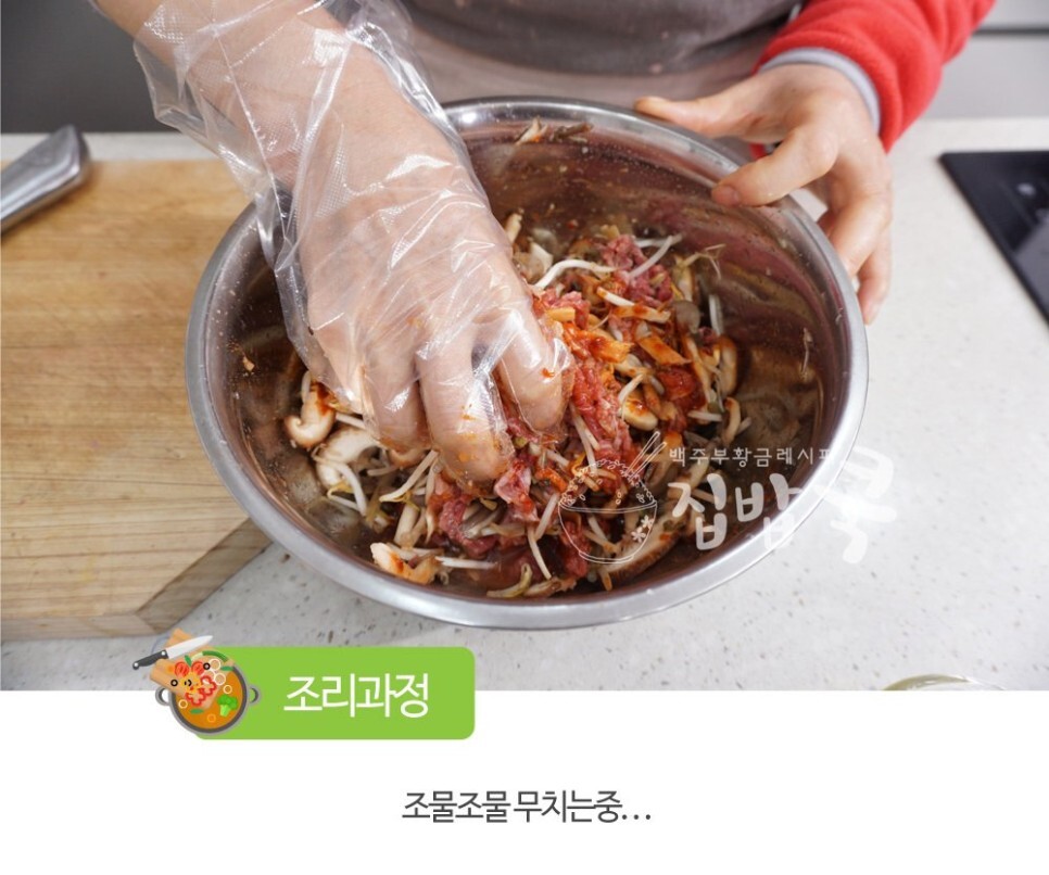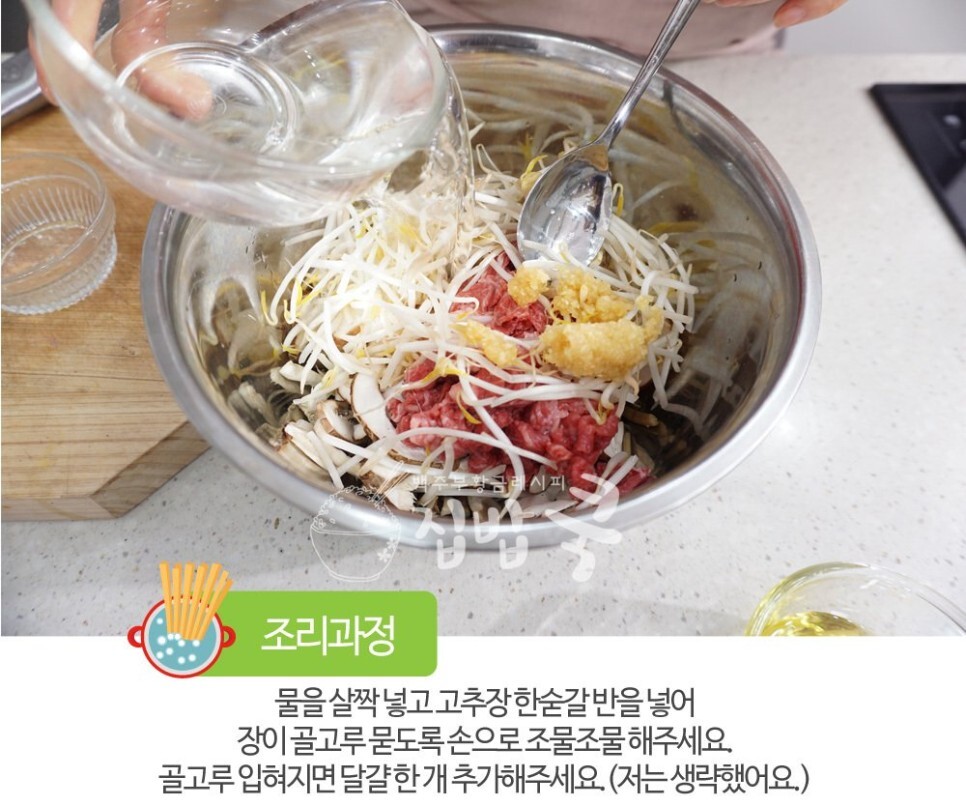 5. 물을 살짝만 넣고 고추장 한숟갈반 정도를 넣어 고추장이 재료에 골고루 묻도록 손으로 조물조물해주세요. (여기서 계란까지 추가하실 분들은 계란 1개를 추가해서 같이 반죽해 주시면 됩니다.)